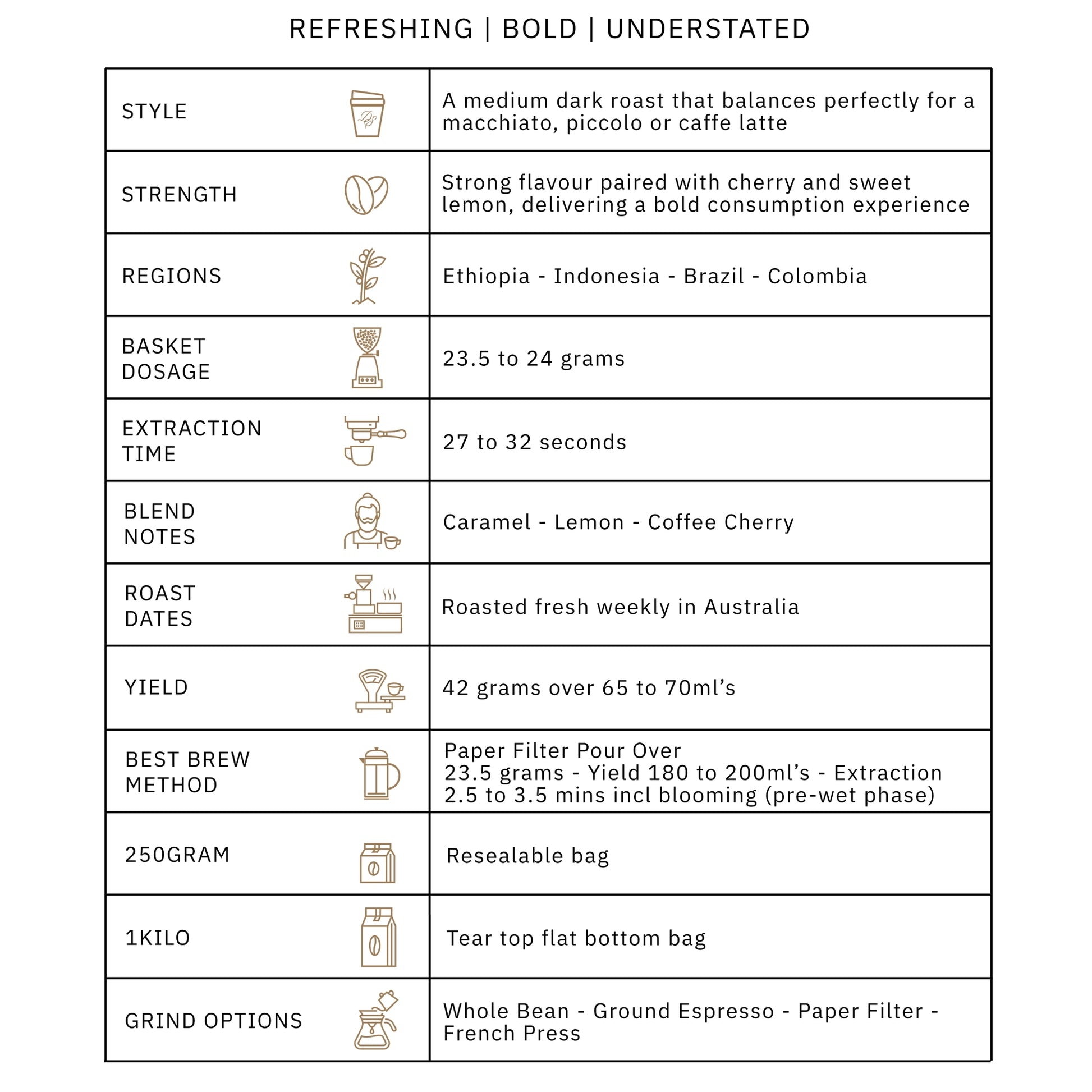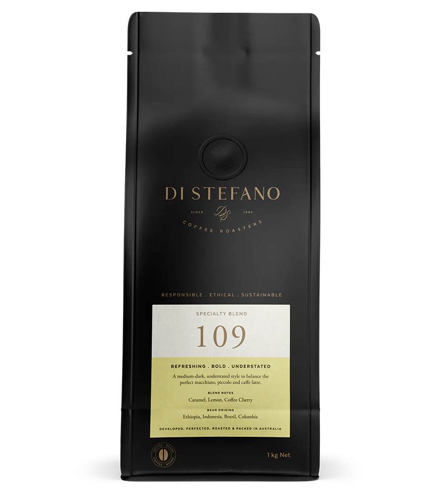 Roasted fresh weekly in Australia, the 109 Blend embodies over 40 years of Di Stefano’s roasting heritage and a commitment to sustainable, consistent quality. With its versatile profile, it performs beautifully in all coffee types, offering a clean finish and a rich aroma your customers will love.
